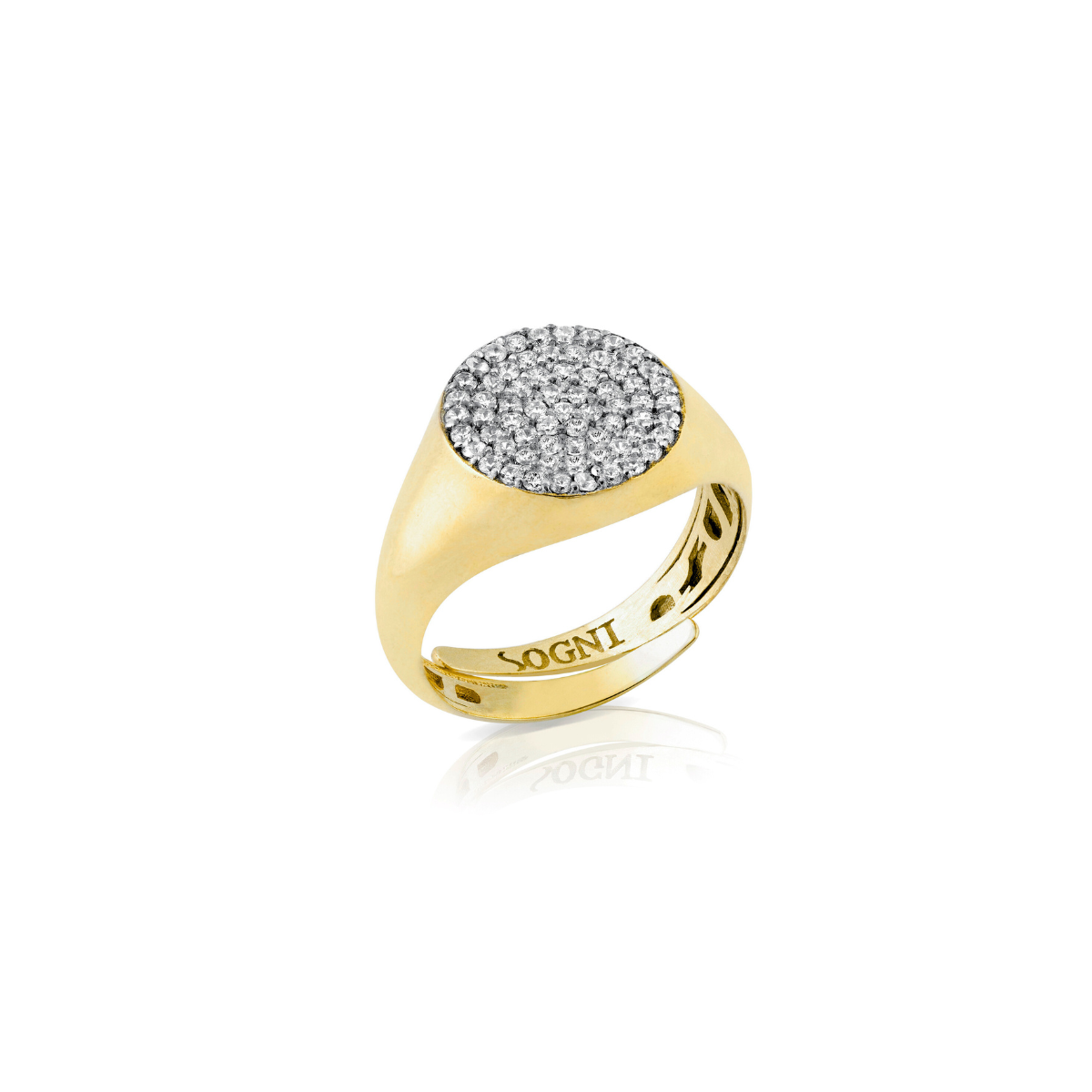 Anello chevalier tondo in argento doratom con zirconi bianchi