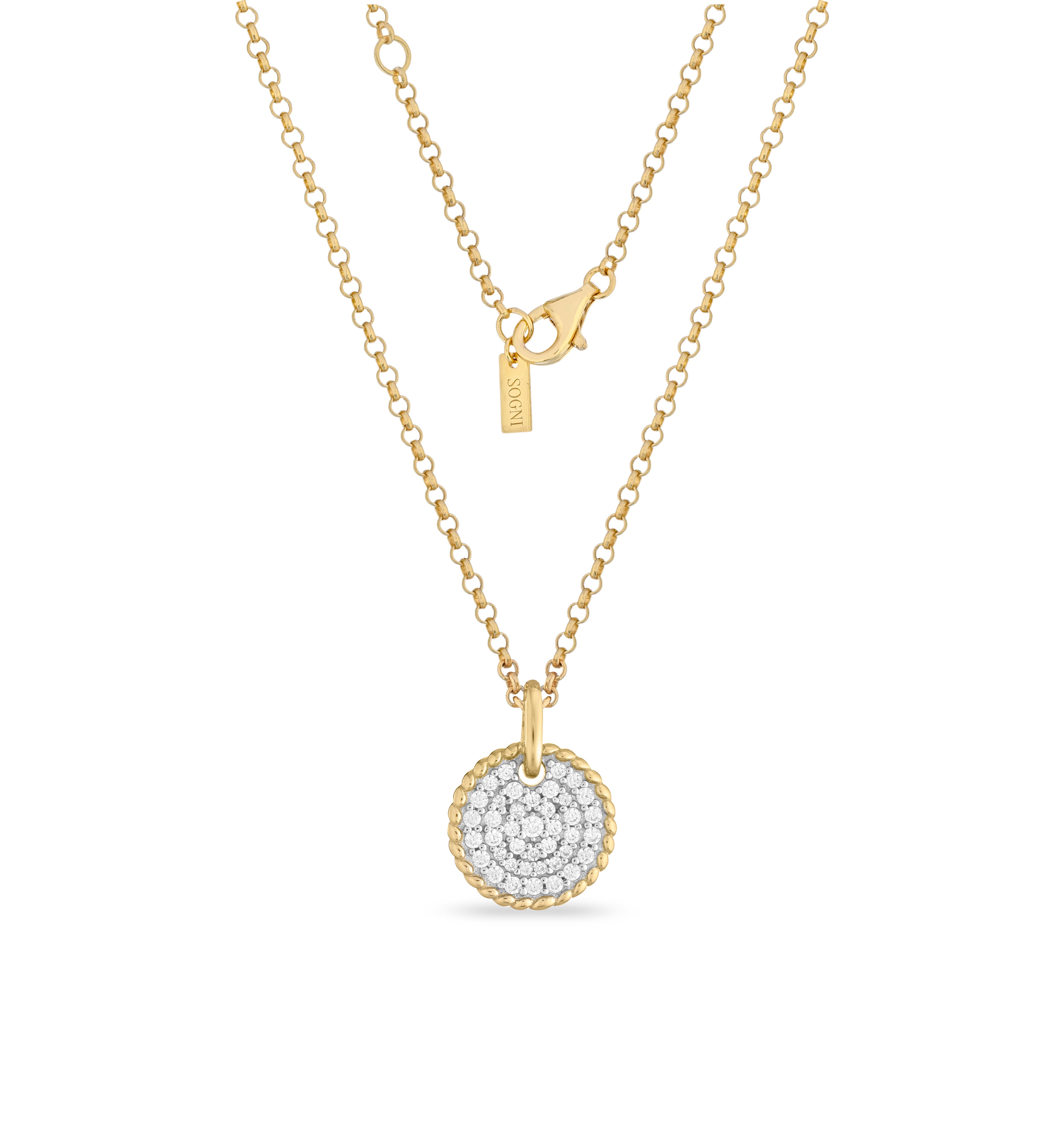 Un cerchio di luce che simboleggia armonia ed eleganza senza tempo. Il ciondolo tondo in argento 925 con placcatura in oro giallo 18kt è completamente impreziosito da un micro pavé di zirconi bianchi che catturano la luce con ogni movimento. Un gioiello versatile e raffinato, perfetto per illuminare ogni look.