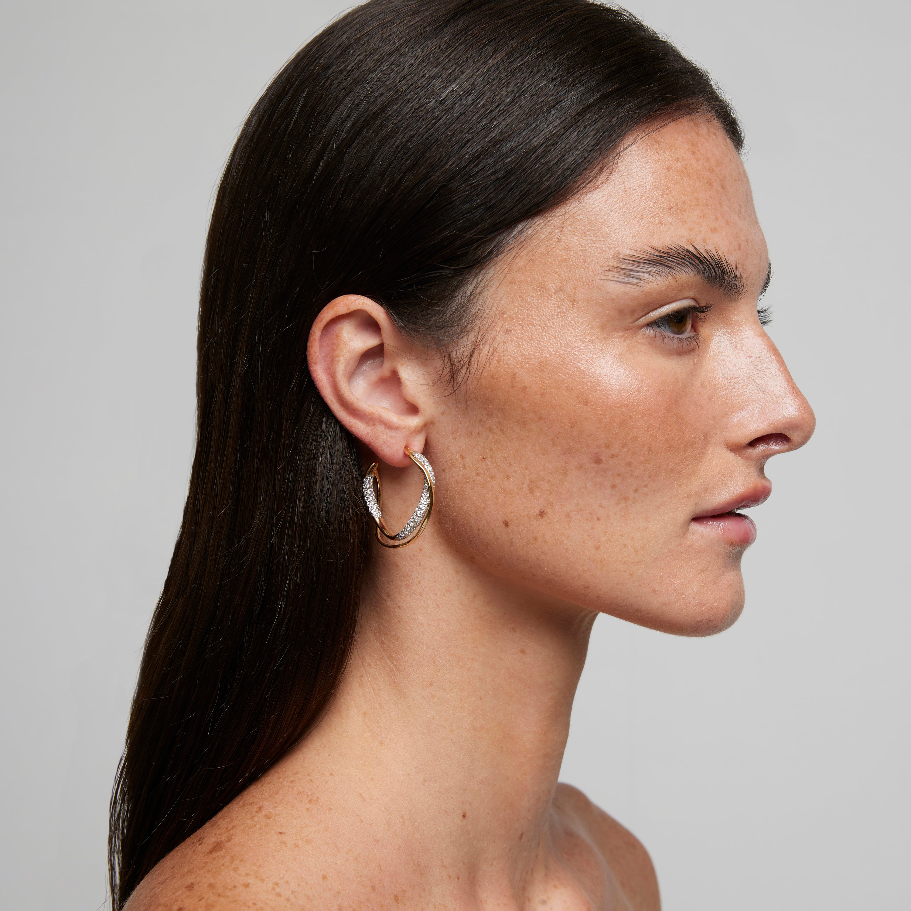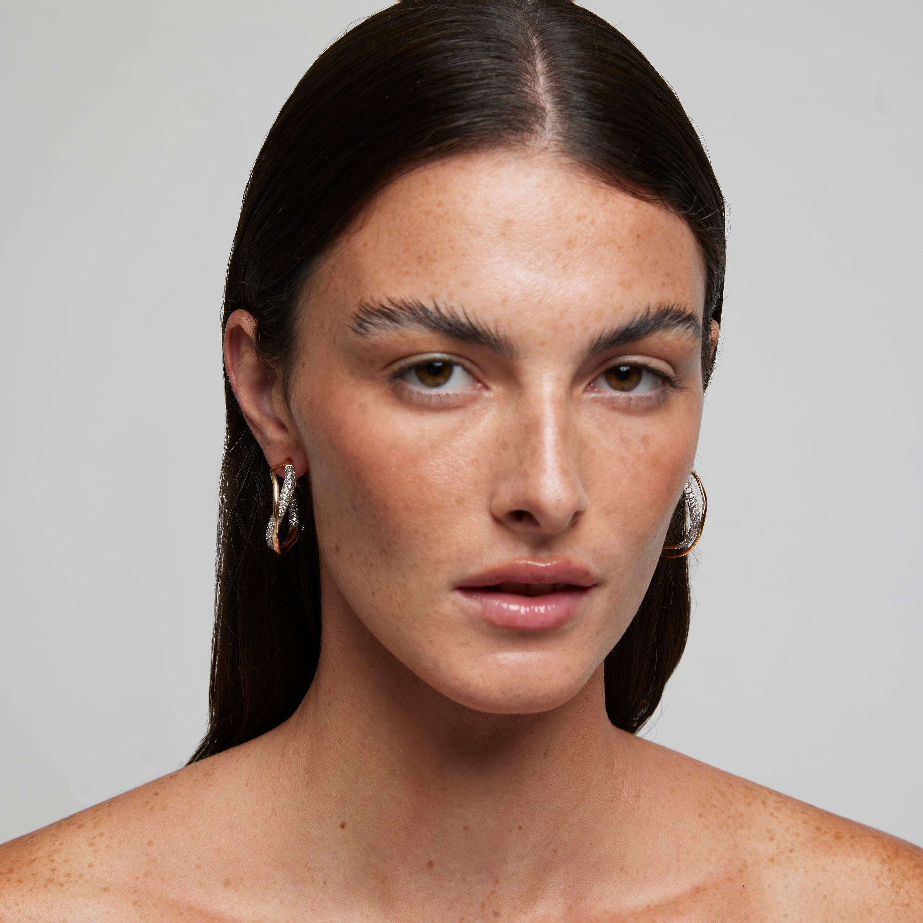 Questi orecchini a spirale intrecciata catturano l'essenza del movimento perpetuo, dove ogni curva dorata si intreccia con la brillantezza dei zirconi in una danza senza fine. Il design sofisticato evoca l'infinito, simbolo di bellezza eterna che accompagna ogni tuo gesto con grazia ipnotica. Due spirali si abbracciano in un gioco di oro caldo e zirconi scintillanti, creando un effetto tridimensionale che cattura la luce da ogni angolazione.