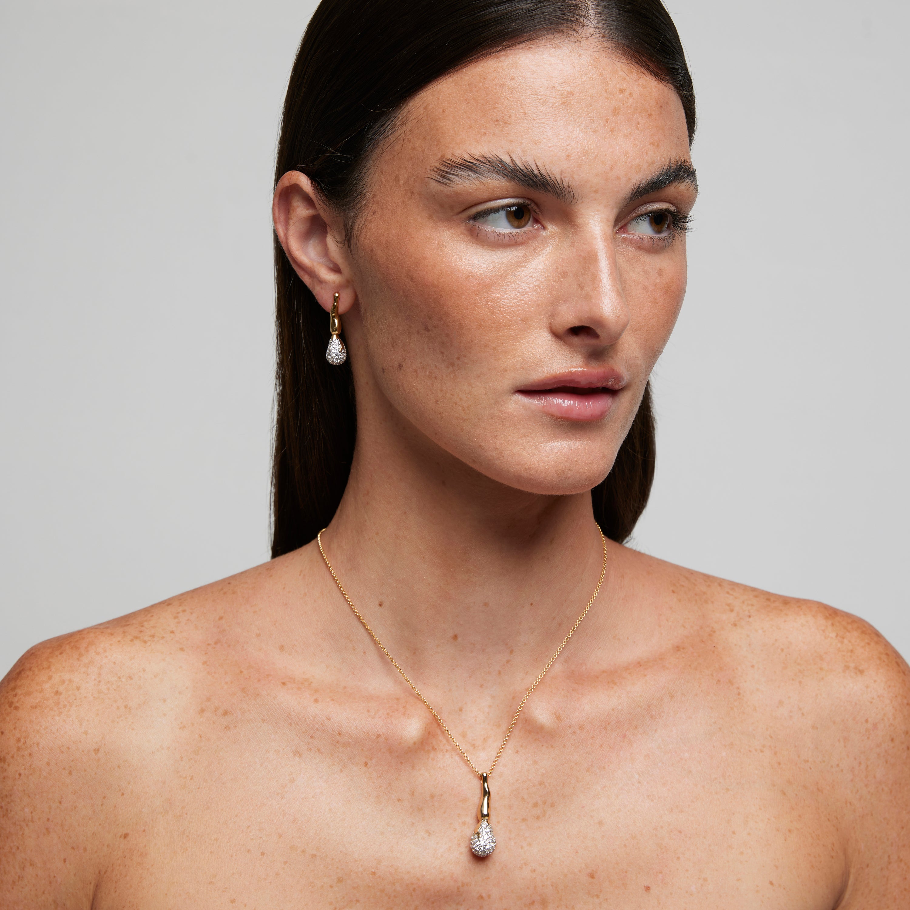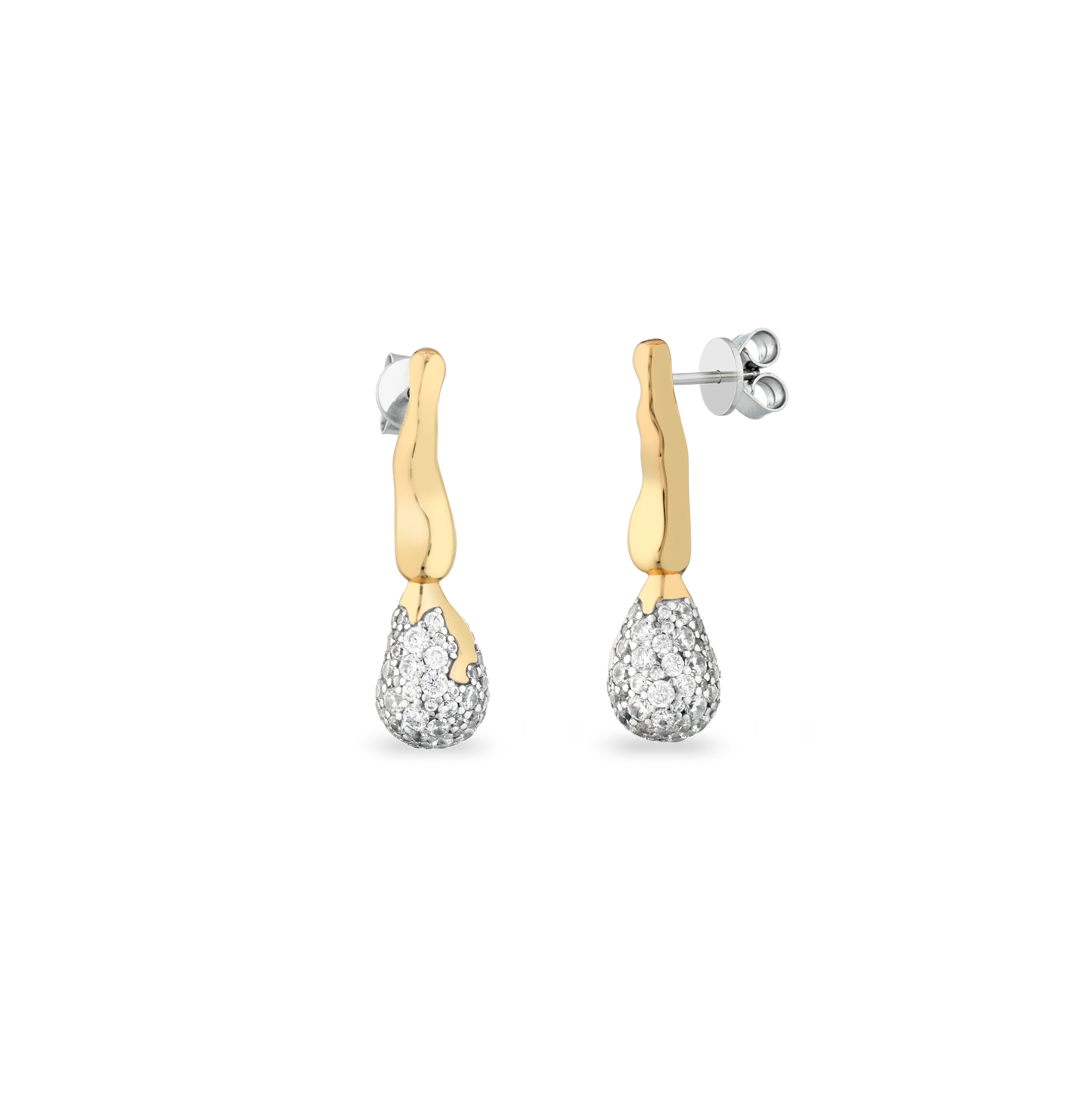 Questi orecchini pendenti a goccia uniscono la raffinatezza dell'oro alla brillantezza dei zirconi in un design che cattura la luce ad ogni movimento.
